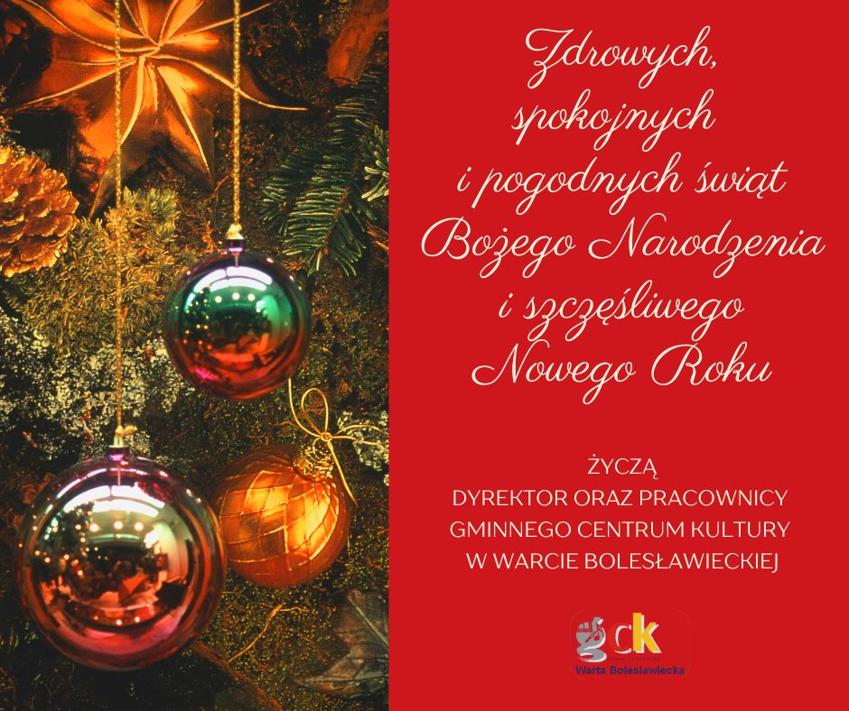 Zdrowych, spokojnych i pogodnych świąt Bożego Narodzenia i szczęśliwego Nowego Roku życzą Dyrektor oraz pracownicy Gminnego Centrum Kultury w Warcie Bolesławieckiej.