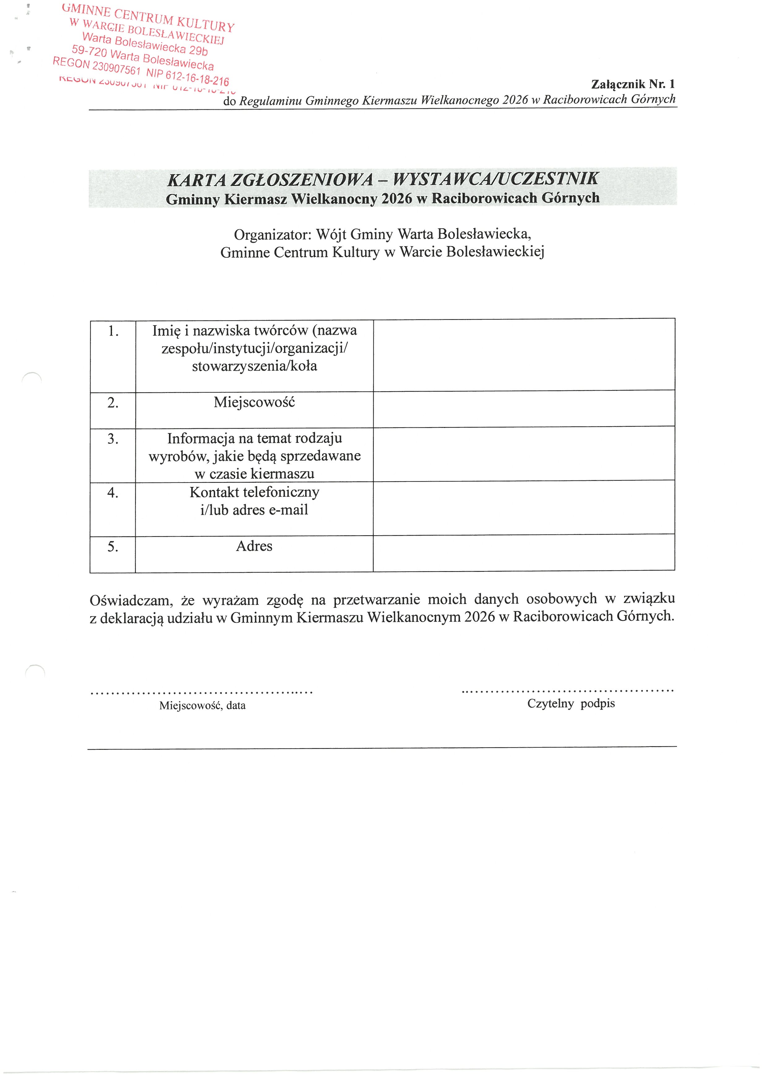 1. Gminne Centrum Kultury w Warcie Bolesławieckiej przyjmuje zgłoszenia udziału w kiermaszu na zasadach określonych w dziale V ZGŁOSZENIA.