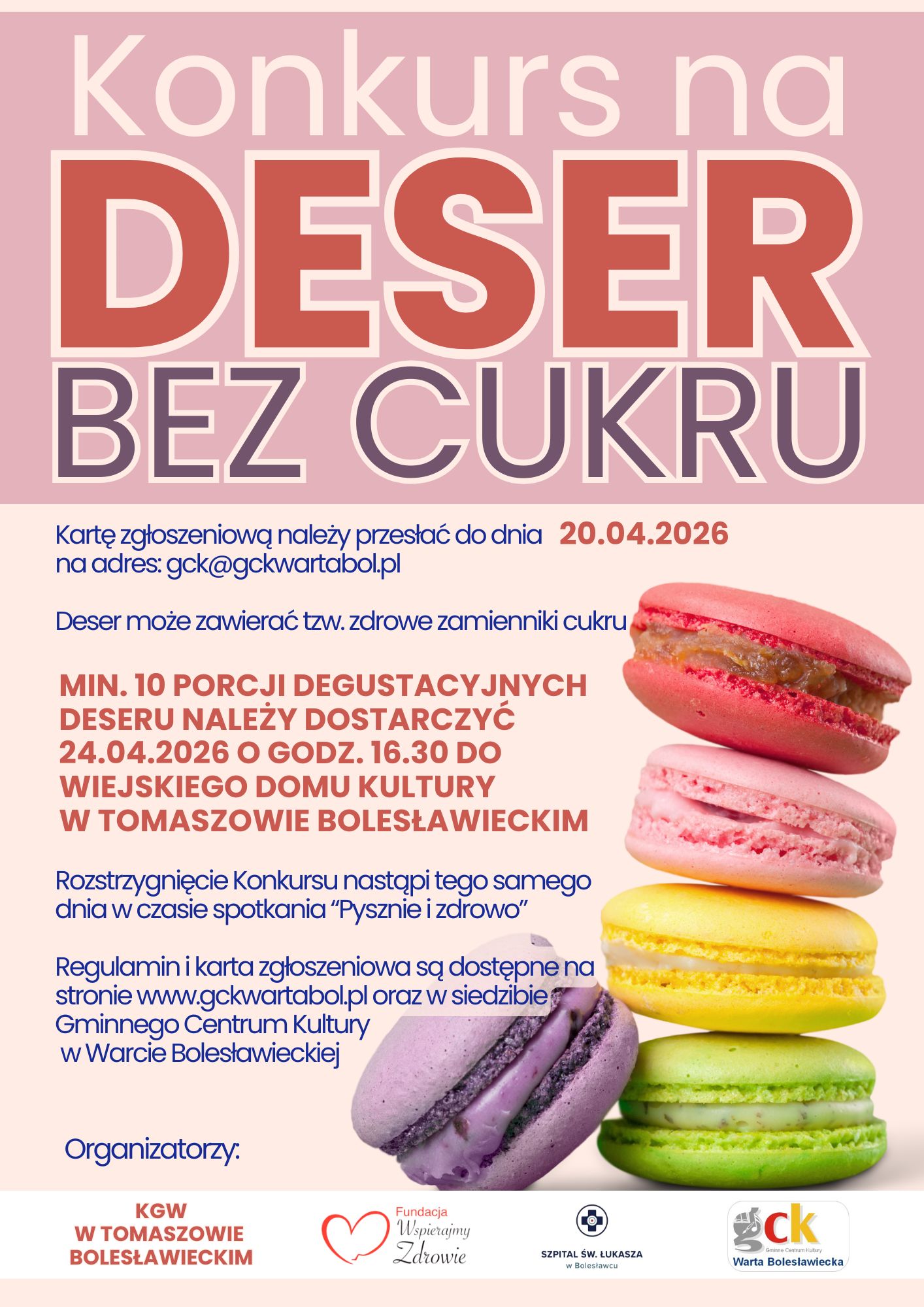 Serdecznie zapraszamy do udziału w konkursie kulinarnym "Deser bez Cukru". Zadaniem uczestników jest przygotowanie 10 porcji degustacyjnych deseru przygotowanego bez użycia cukru (można użyć zdrowych zamienników) i dostarczenie ich do Wiejskiego Domu Kultury w Tomaszowie Bolesławieckim w dniu 24.04.2026 o godz. 16.30.
