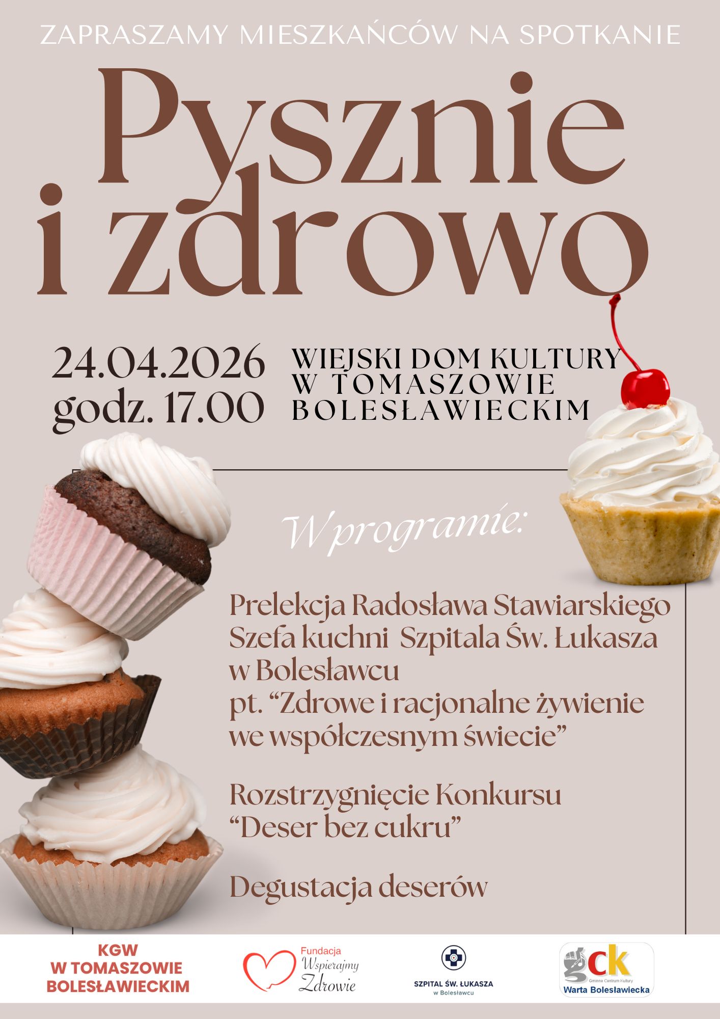 Rozstrzygnięcie konkursu nastąpi tego samego dnia w Wiejskim Domu Kultury w czasie spotkania "Pysznie i zdrowo", które rozpocznie się o godz. 17.00 prelekcją Radosława Stawiarskiego, Szefa kuchni Szpitala Św. Łukasza w Bolesławcu. W czasie spotkania będzie można spróbować konkursowych deserów.