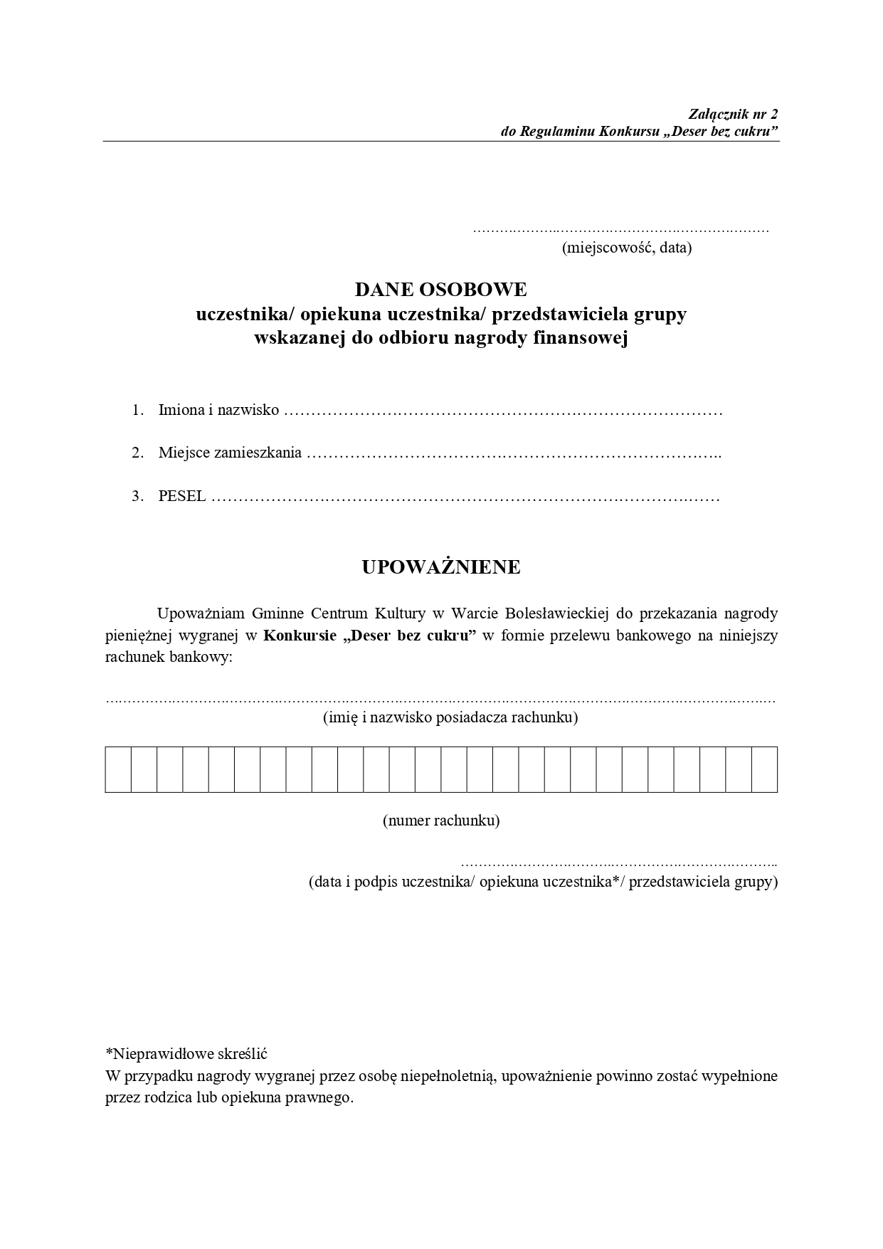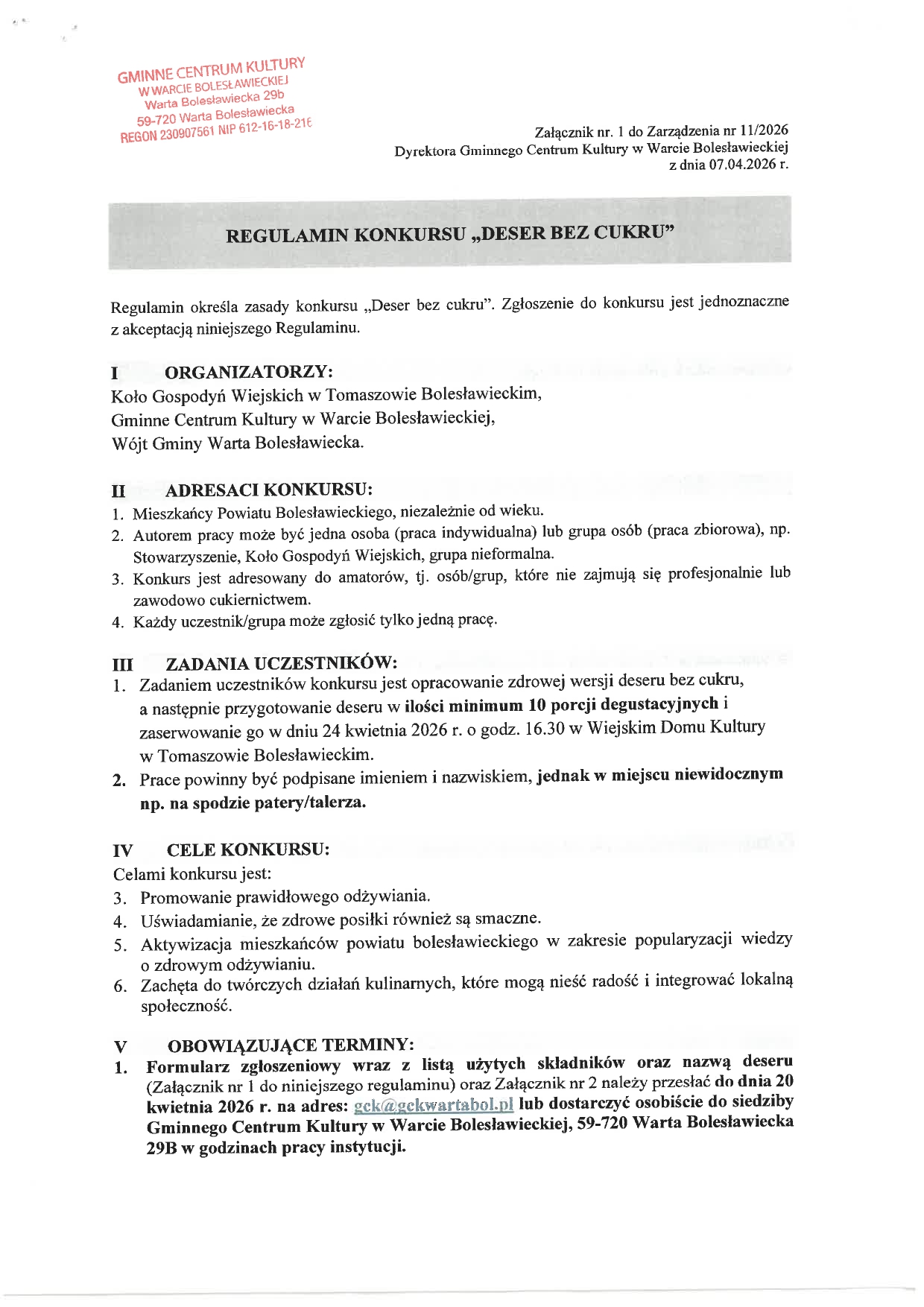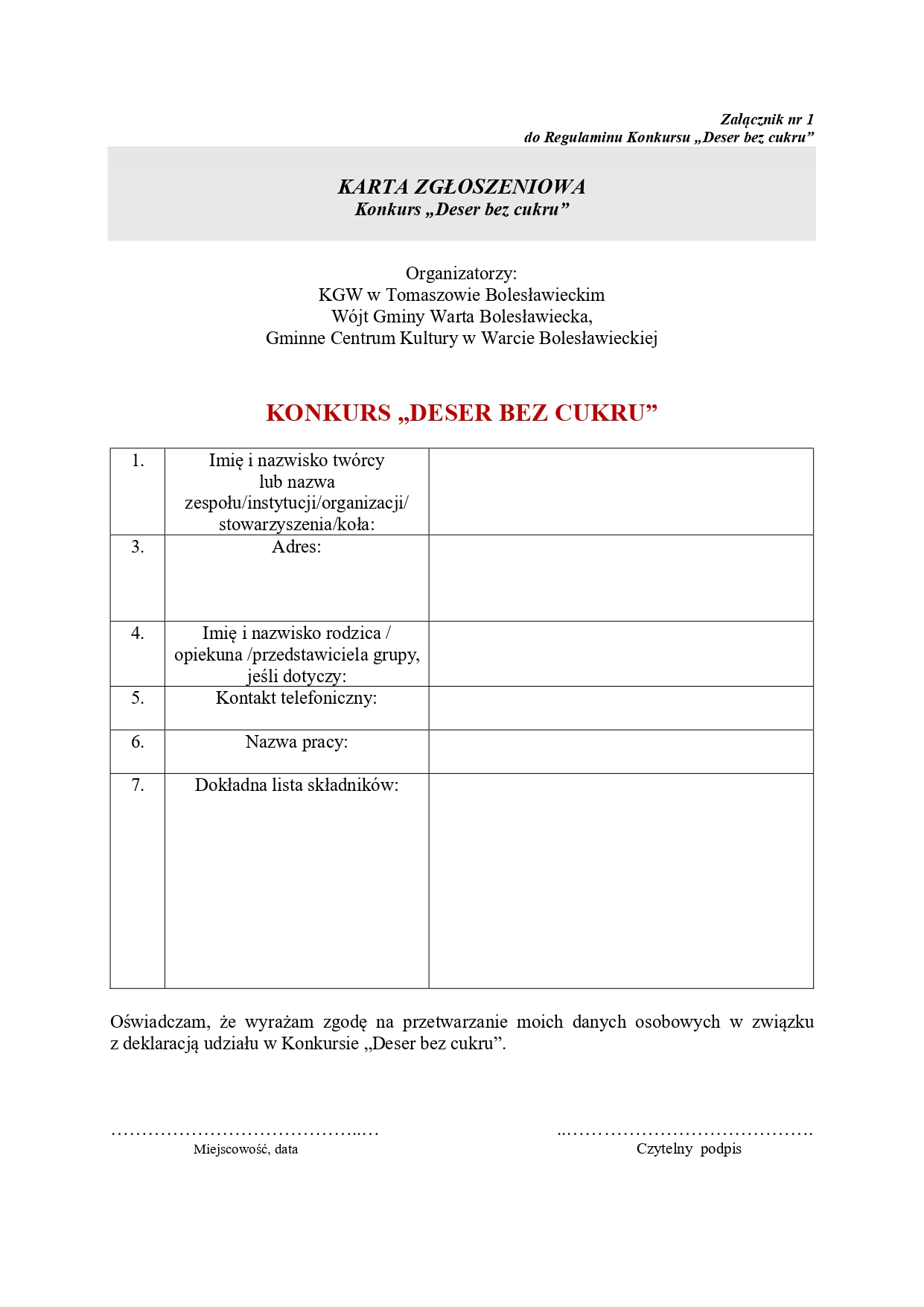1. Formularz zgłoszeniowy wraz z listą użytych składników oraz nazwą deseru (Załącznik nr 1 do niniejszego regulaminu) oraz Załącznik nr 2 należy przesłać do dnia 20 kwietnia 2026 r. na adres: Ten adres pocztowy jest chroniony przed spamowaniem. Aby go zobaczyć, konieczne jest włączenie w przeglądarce obsługi JavaScript. lub dostarczyć osobiście do siedziby Gminnego Centrum Kultury w Warcie Bolesławieckiej, 59-720 Warta Bolesławiecka 29B w godzinach pracy instytucji.
