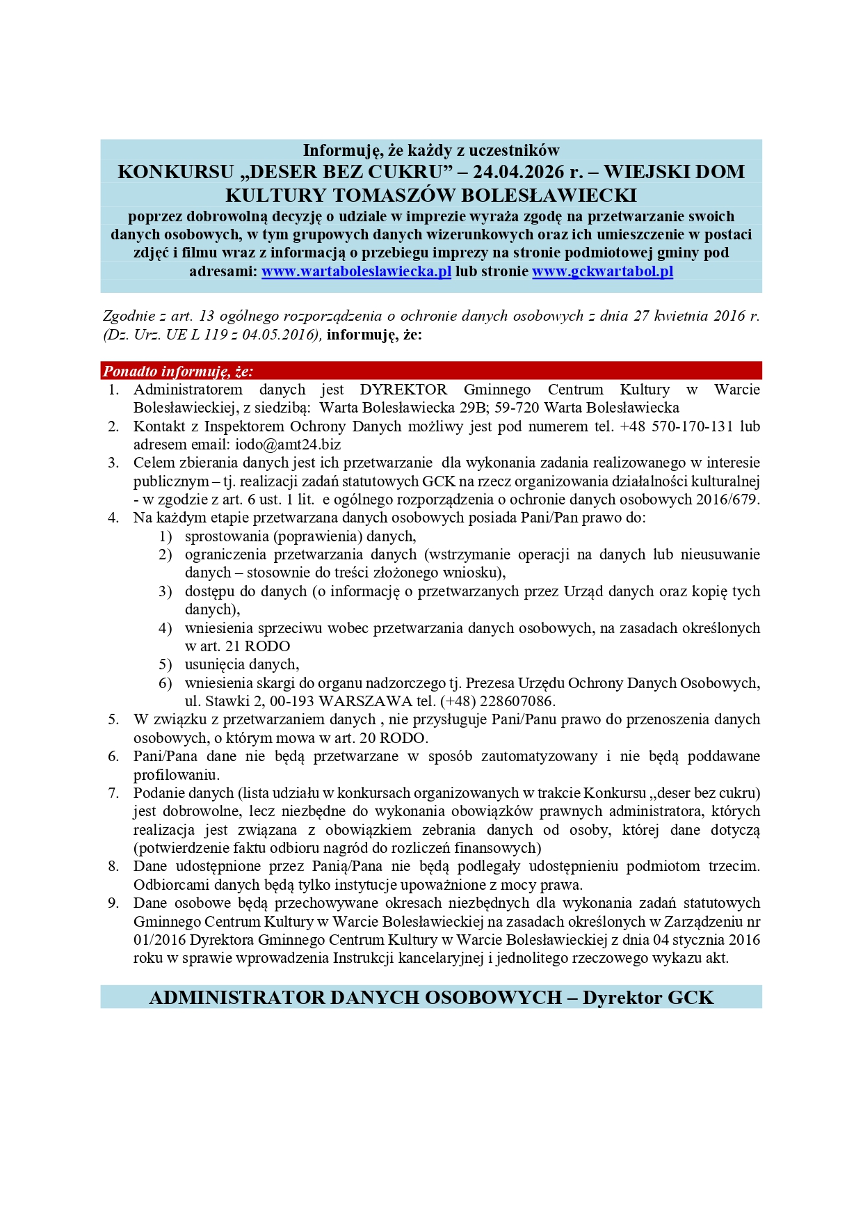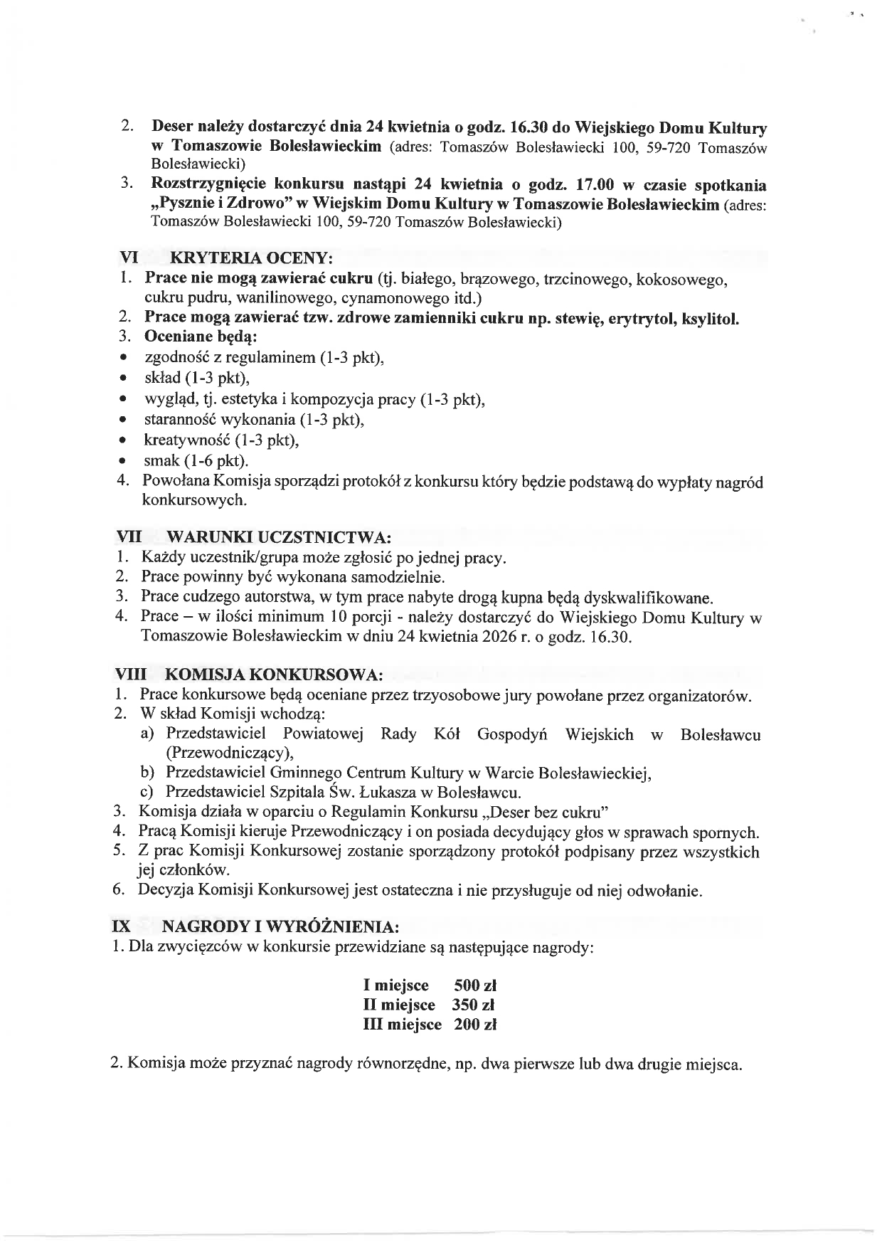 2. Deser należy dostarczyć dnia 24 kwietnia o godz. 16.30 do Wiejskiego Domu Kultury w Tomaszowie Bolesławieckim (adres: Tomaszów Bolesławiecki 100, 59-720 Tomaszów Bolesławiecki)