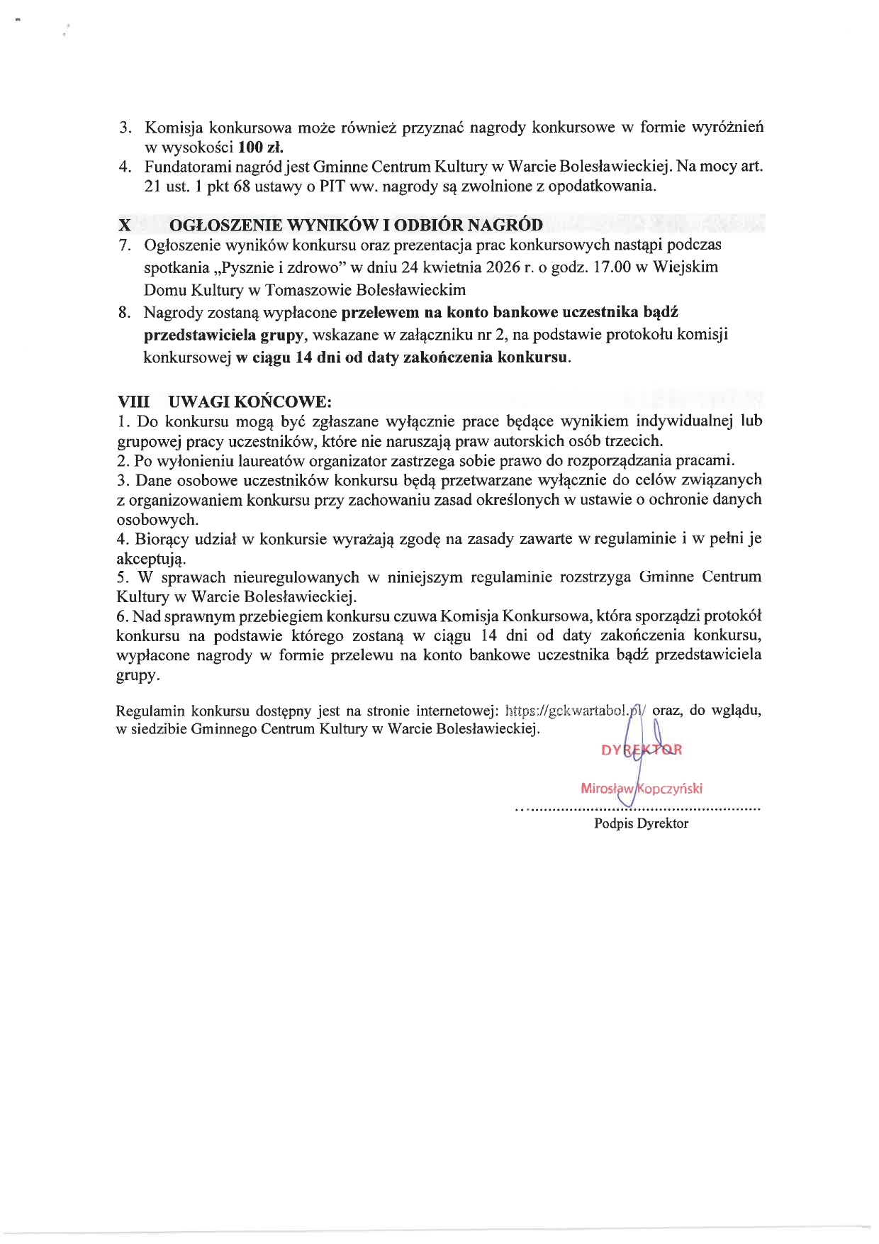 7. Ogłoszenie wyników konkursu oraz prezentacja prac konkursowych nastąpi podczas spotkania „Pysznie i zdrowo” w dniu 24 kwietnia 2026 r. o godz. 17.00 w Wiejskim Domu Kultury w Tomaszowie Bolesławieckim