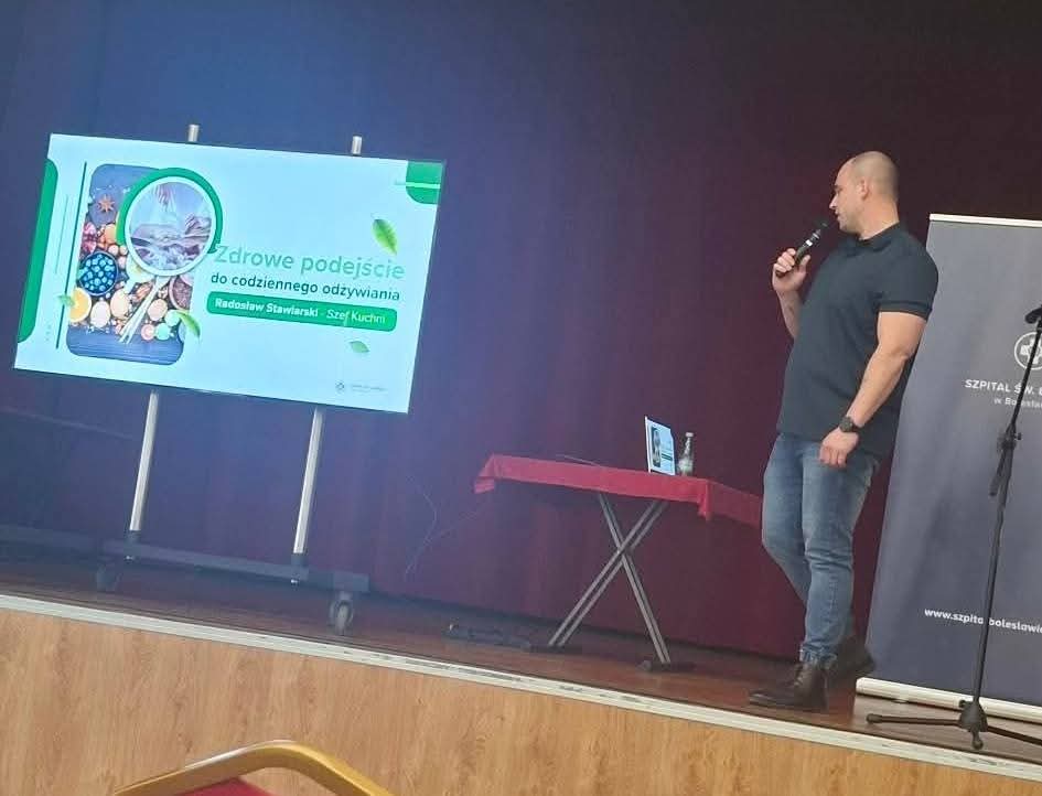 Spotkanie rozpoczęło się prelekcją Radosława Stawiarskiego, Szefa Kuchni Szpitala Św. Łukasza w Bolesławcu, który opowiadał o wyzwaniach współczesnego świata w kontekście zdrowego i racjonalnego żywienia 🍜🥗. Odpowiadał także na liczne pytania publicznosci dotyczące popularnych diet oraz zasadności stosowania konkretnych produktów, takich jak np. cynamon 🧂🫚🌶️.