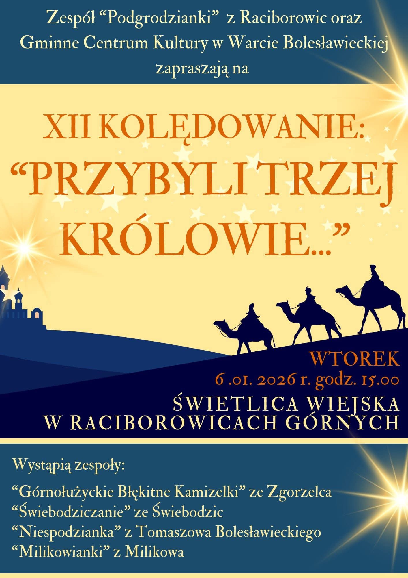 Gminne Centrum Kultury w Warcie Bolesławieckiej oraz Zespół "Podgrodzianki" z Raciborowic zapraszają na XII kolędowanie pod nazwą "Przybyli Trzej Królowie", które odbędzie się 06.01.2026 r. o godz. 15.00 w Świetlicy Wiejskiej w Raciborowicach Górnych. Wśród zaproszonych zespołów znalazły się: