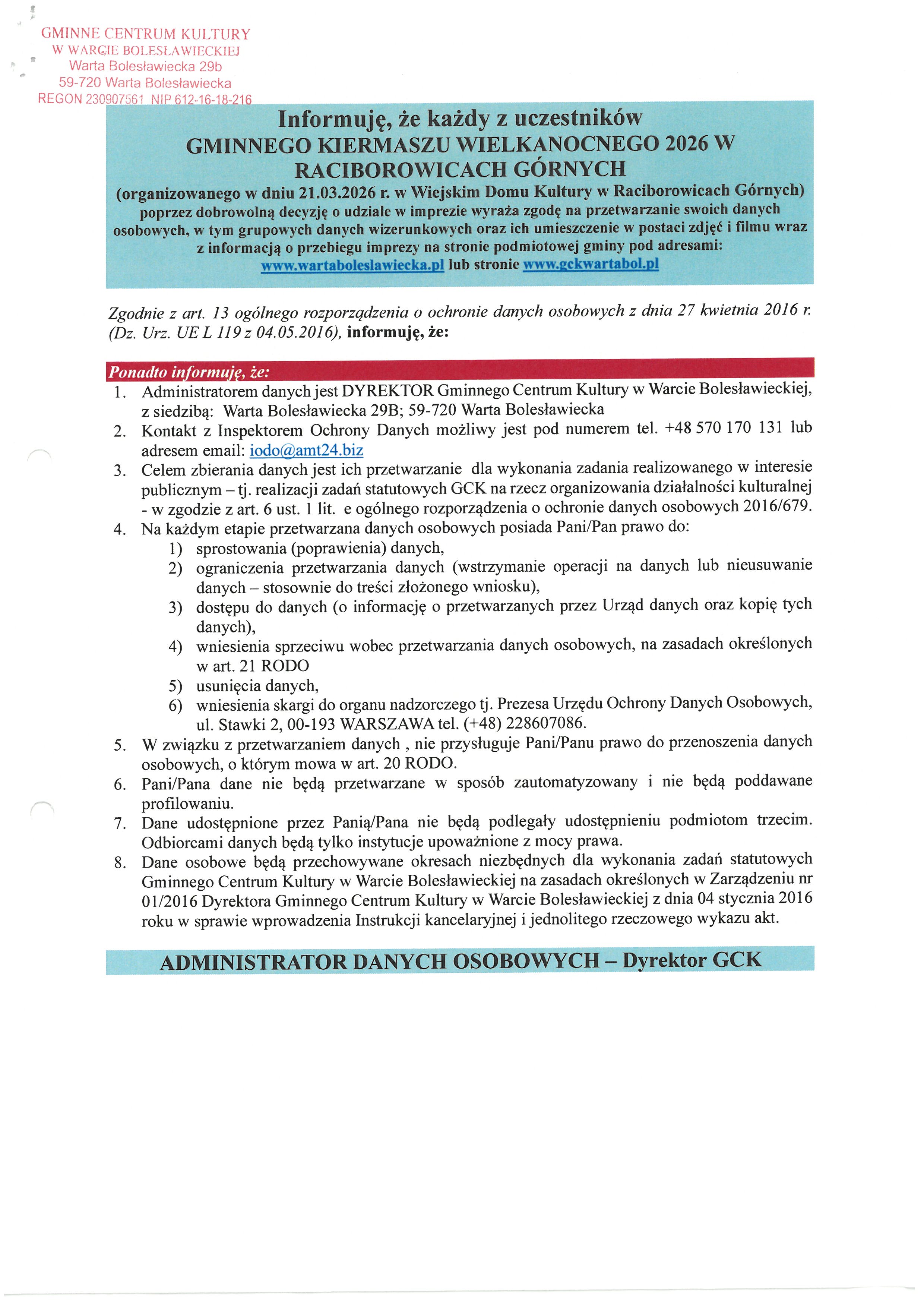 Dane osobowe uczestników kiermaszu będą przetwarzane wyłącznie do celów związanych z organizowaniem kiermaszu przy zachowaniu zasad określonych w ustawie o ochronie danych osobowych. Biorący udział w kiermaszu wyrażają zgodę na zasady zawarte w regulaminie i w pełni je akceptują. W sprawach nieuregulowanych w niniejszym regulaminie rozstrzyga Gminne Centrum Kultury w Warcie Bolesławieckiej.