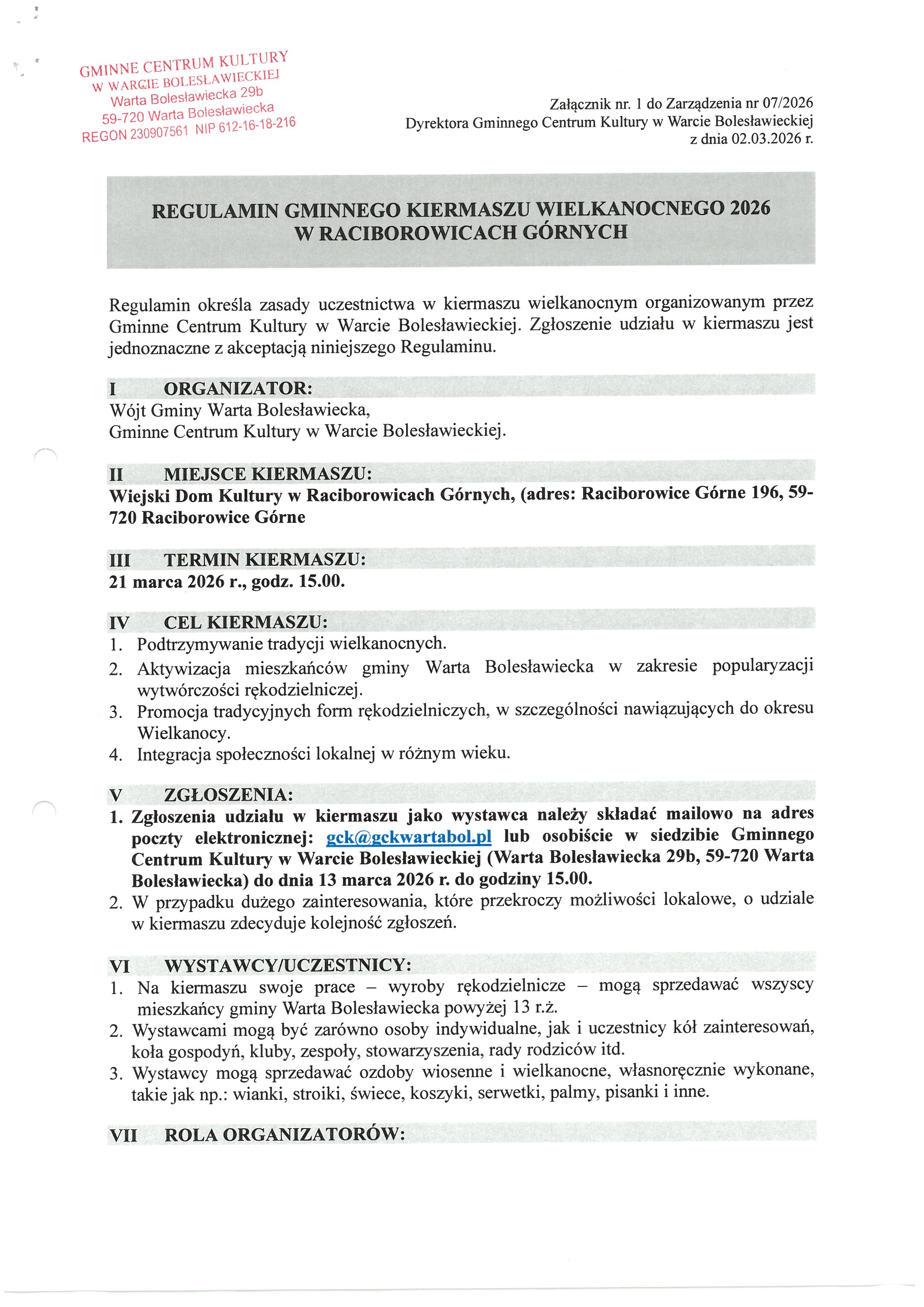 REGULAMIN GMINNEGO KIERMASZU WIELKANOCNEGO 2026 W RACIBOROWICACH GÓRNYCH