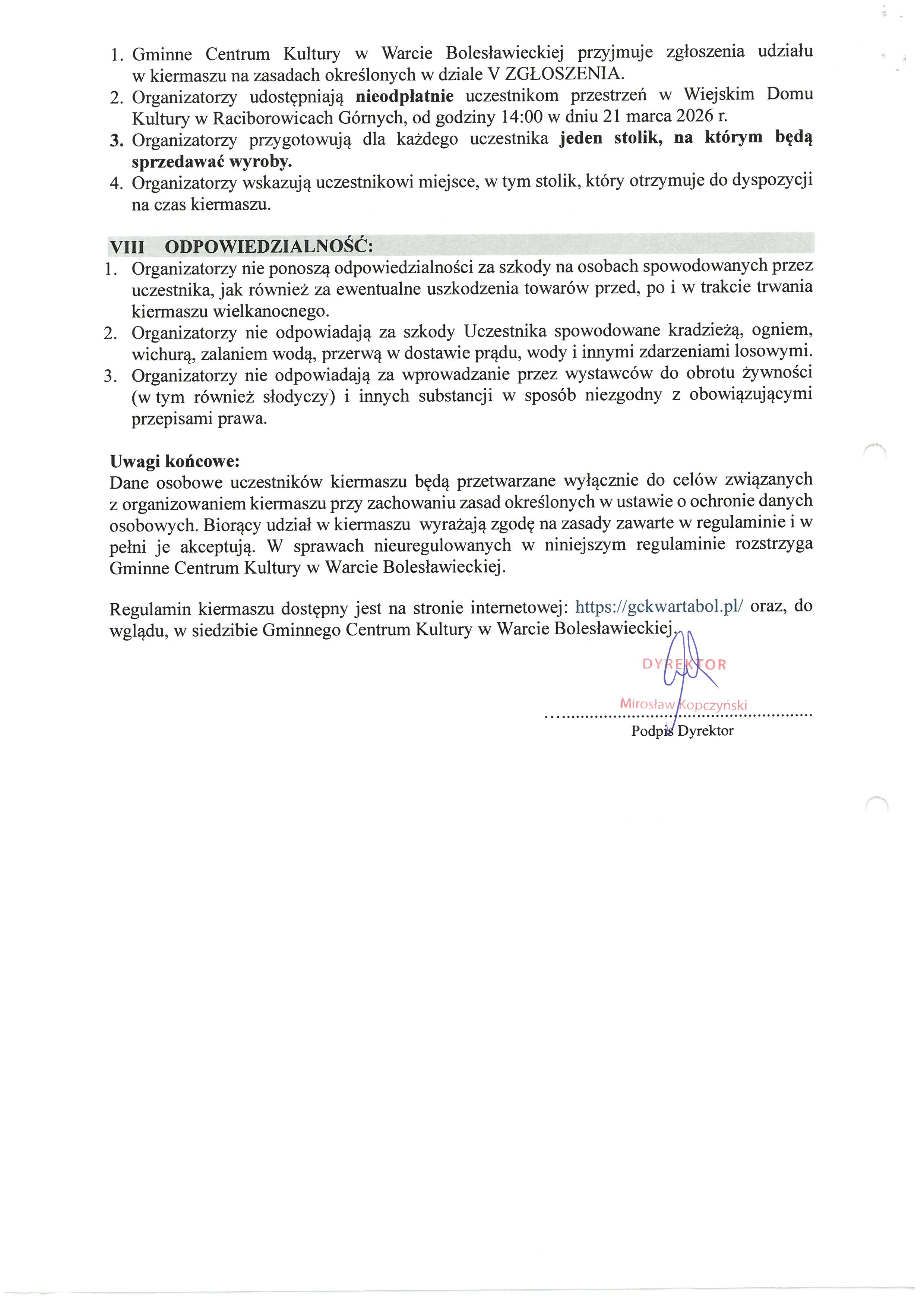 1. Organizatorzy nie ponoszą odpowiedzialności za szkody na osobach spowodowanych przez uczestnika, jak również za ewentualne uszkodzenia towarów przed, po i w trakcie trwania kiermaszu wielkanocnego.