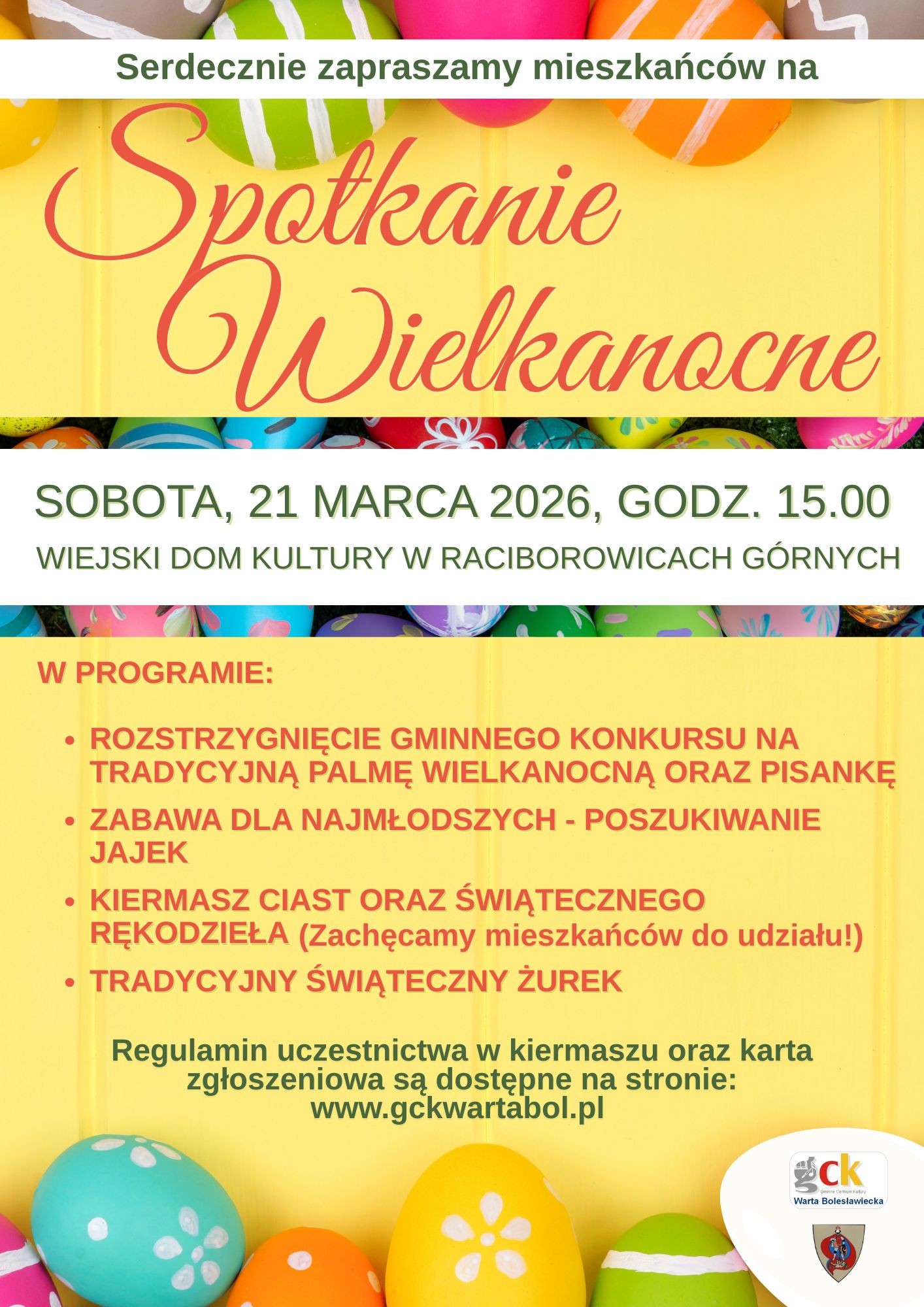 Zapraszamy na SPOTKANIE WIELKANOCNE, które odbędzie się w dniu 21.03.2026 r. (sobota) o godz. 15.00 w Wiejskim Domu Kultury w Raciborowicach Górnych.
